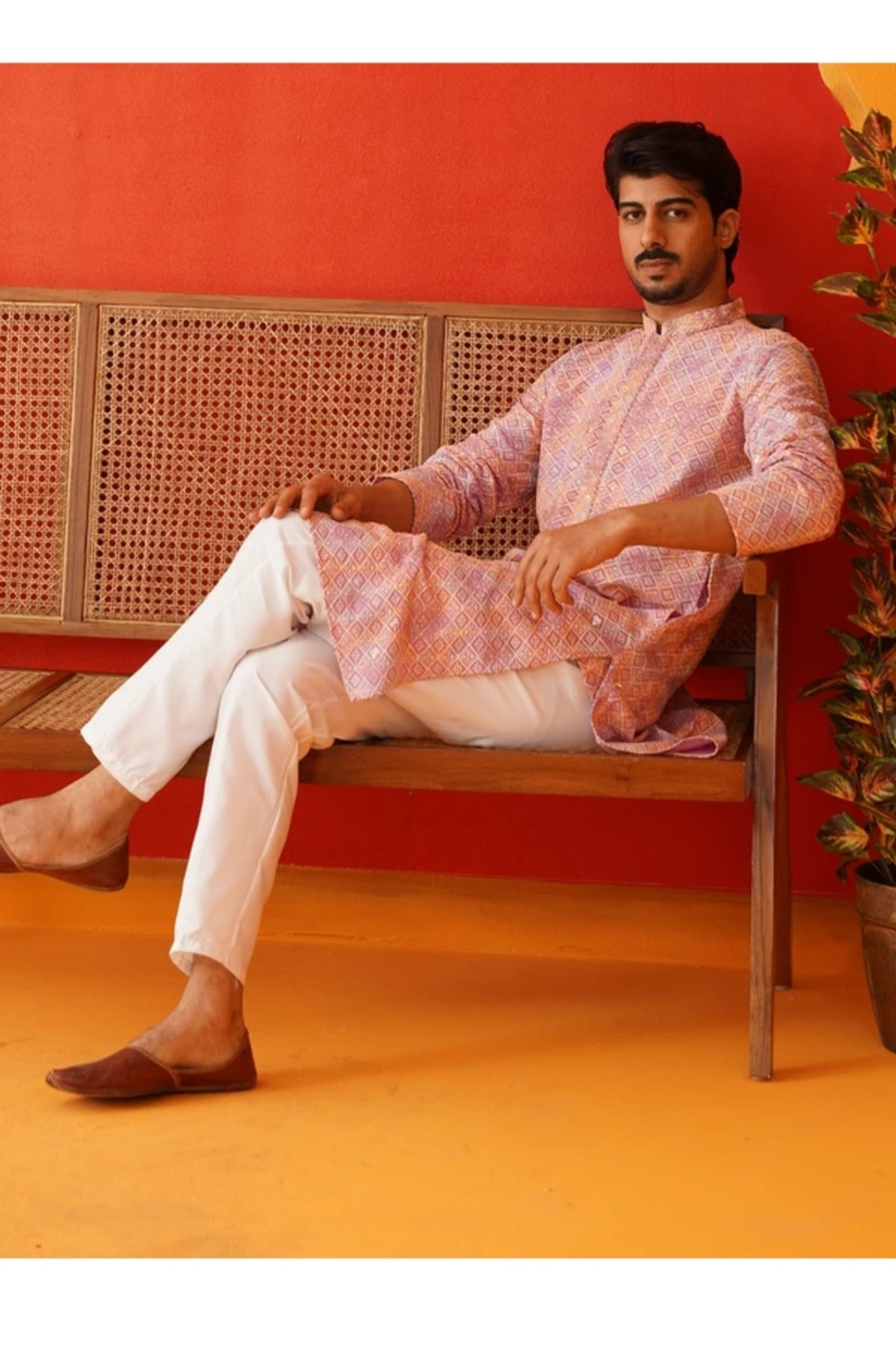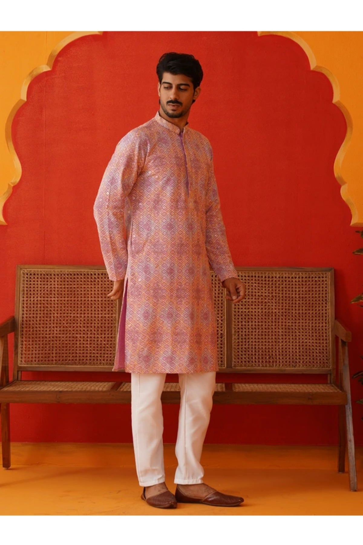 Bold and playful, this kurta blends saffron, lilac, and white in an all-over geometric print. The subtle mirror work catches light just enough for a festive feel without going over the top. Perfect for haldi, sangeet, or festive brunches. Comes with white churidar bottoms.