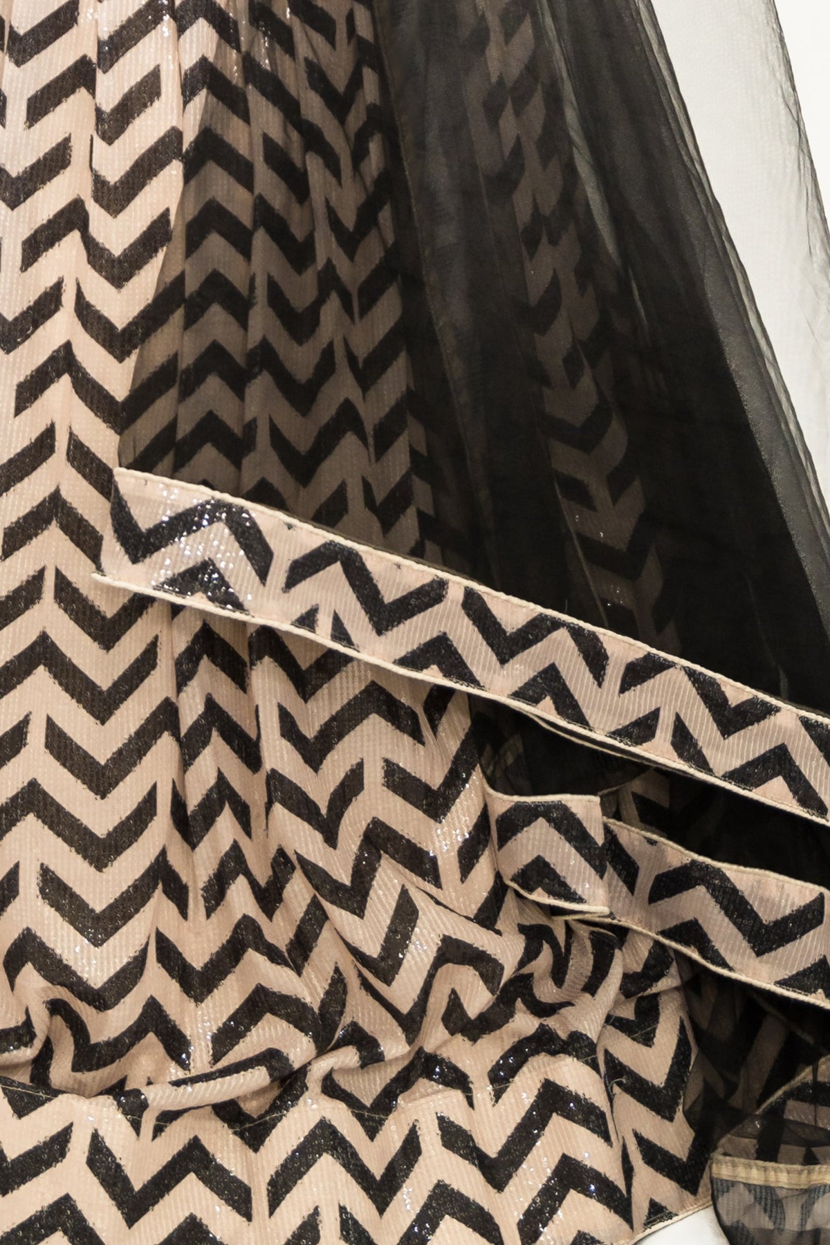 Turn heads in this stunning black and beige lehenga, where classic meets just the right amount of glam. The chevron design of the skirt brings drama in the best way, while the all-over silver sequin stitching work adds that subtle shimmer. The beige blouse features a sweetheart neckline and no sleeves, adorned with the same silver sequin patterns, adding a touch of subtlety. Add the matching black net dupatta with the same chevron patterns on its borders to create the ideal outfit for any celebration where you want to look glamourous and elegant. |