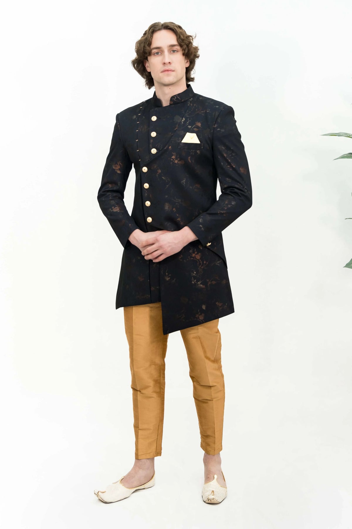 This black asymmetric Indo-Western set is a seamless blend of traditional charm and contemporary style. The ensemble features a striking asymmetric jacket in a timeless black hue, adorned with intricate thread work and delicate sequin detailing in a captivating geometric pattern. Paired with tailored trousers or dhoti pants, it exudes a refined yet modern aesthetic. The subtle shimmer of the sequins adds a touch of glamour, making this set a perfect choice for weddings, cocktail parties, festive celebrations, or any occasion that calls for a balance of elegance and sophistication. |