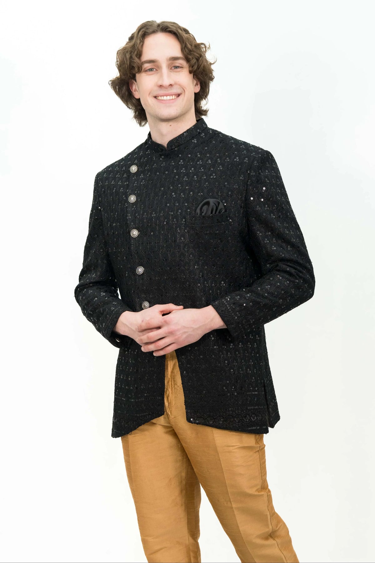 This black asymmetric Indo-Western set is a seamless blend of traditional charm and contemporary style. The ensemble features a striking asymmetric jacket in a timeless black hue, adorned with intricate thread work and delicate sequin detailing in a captivating geometric pattern. Paired with tailored trousers or dhoti pants, it exudes a refined yet modern aesthetic. The subtle shimmer of the sequins adds a touch of glamour, making this set a perfect choice for weddings, cocktail parties, festive celebrations, or any occasion that calls for a balance of elegance and sophistication.