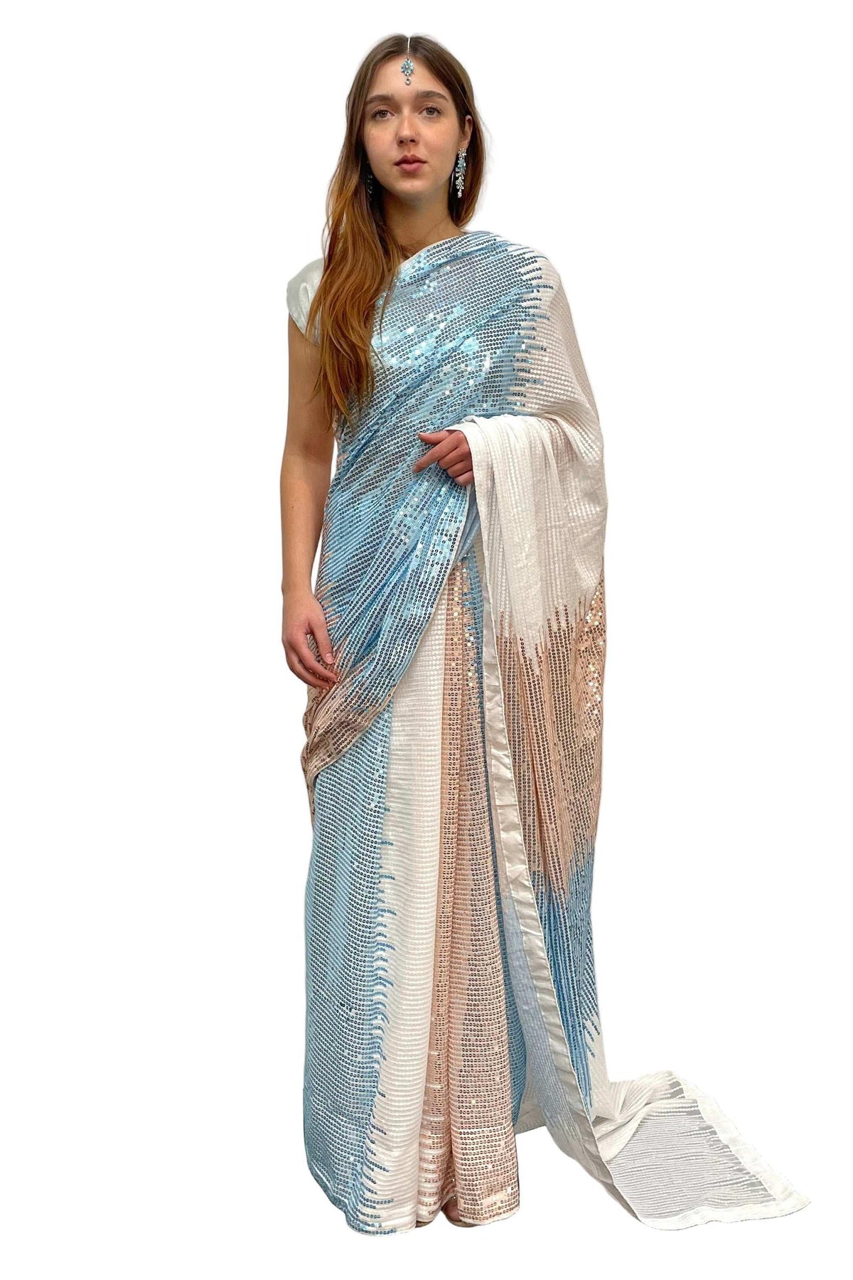 Engage all the attention on yourself when you get dressed with the beautifully handcrafted one-off piece. Look elegant in this unique saree which has hand embroidery throughout the skirt and on pally laid on pure georgette in a beautiful hue of blue. |