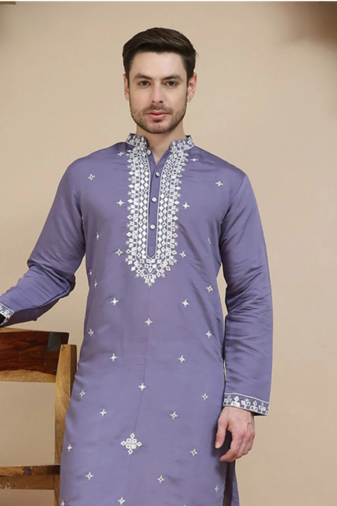 A soft lilac kurta highlighted with intricate mirror work and white thread embroidery along the placket, collar, cuffs, and scattered across the body. The clean silhouette and subtle color make this a standout yet wearable piece for mehendi nights, poojas, or Diwali gatherings. Pair with white or beige churidar pants to complete the look. |