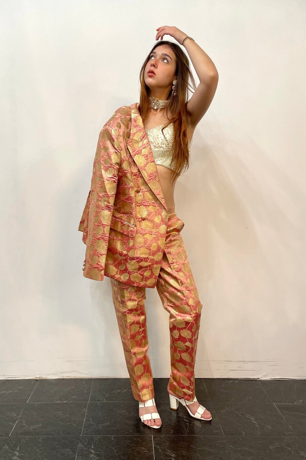 Elevate your style with this plush pink fusion set, featuring a tailored jacket and matching pants in a rich brocade weave. The warm pink-gold tones bring a luxe, modern charm that stands out effortlessly. Perfect for sangeets, cocktail nights, or festive gatherings, this set blends traditional elegance with contemporary structure. Step in with confidence and make a bold, graceful statement.
