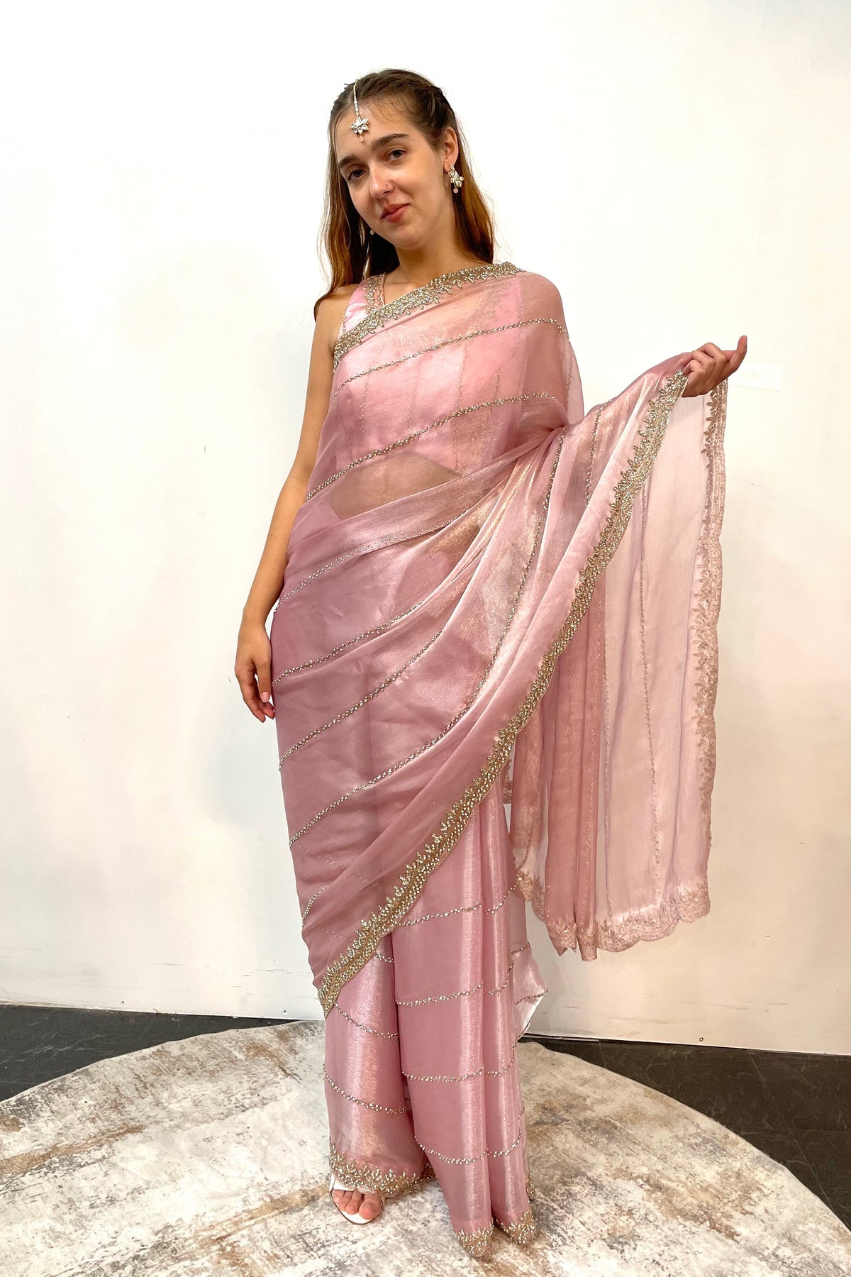 Engage all the attention on yourself when you get dressed with the beautifully handcrafted one-off piece. Look elegant in this unique saree which has crystal border laid on glass tissue in a beautiful hue of pink. |