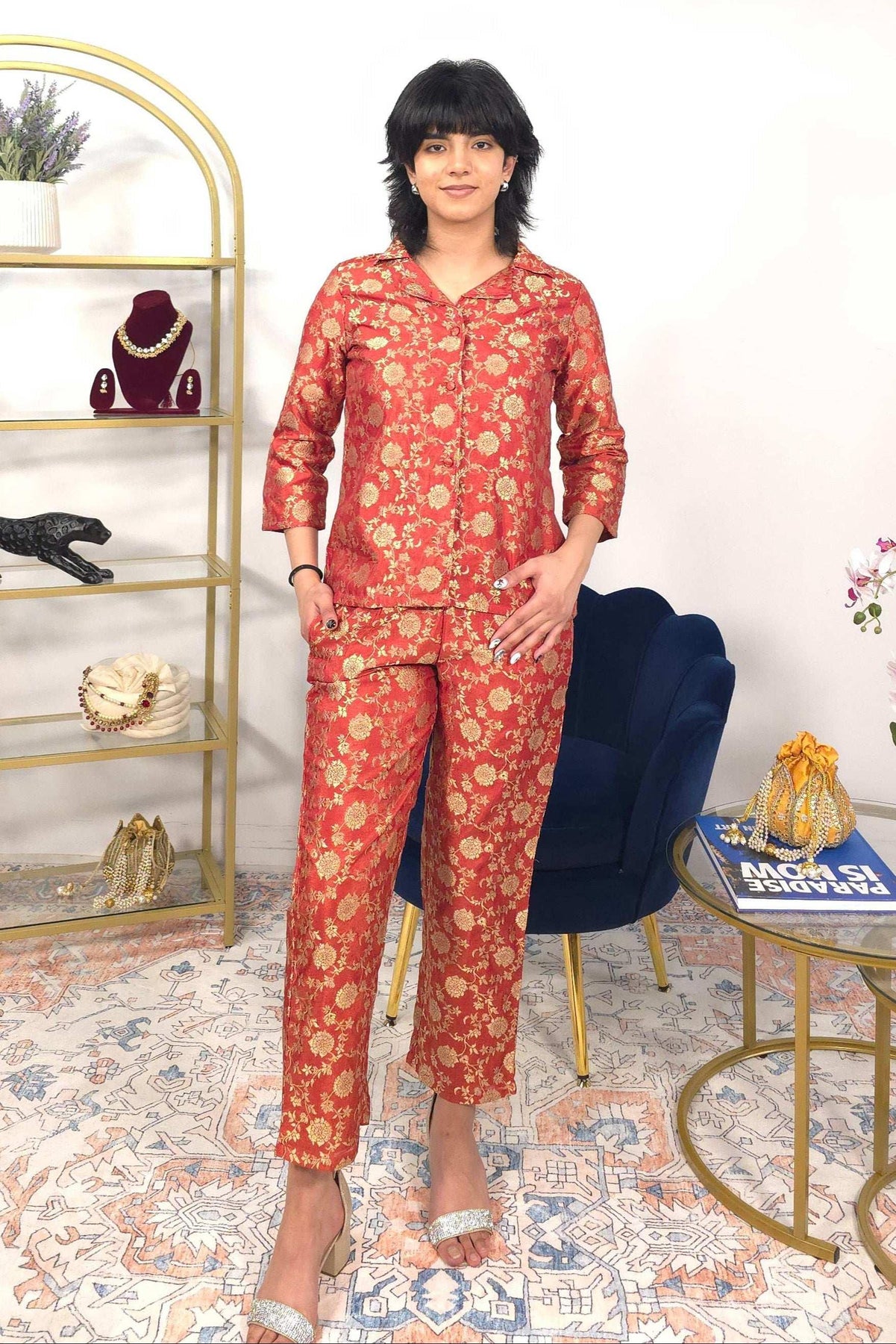 Radiate elegance with this burnt orange set, featuring a long-sleeve shirt and tailored pants adorned with intricate gold work. Perfect for festive occasions, weddings, or evening celebrations, this ensemble blends traditional artistry with modern sophistication. Make a bold style statement with its rich hues and luxurious details. |